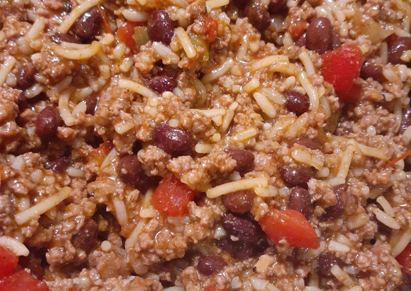 - Cook Spanish rice according to directions. Toss Spanish rice into skillet, beans and remaining ingredients into skillet. Heat completely.