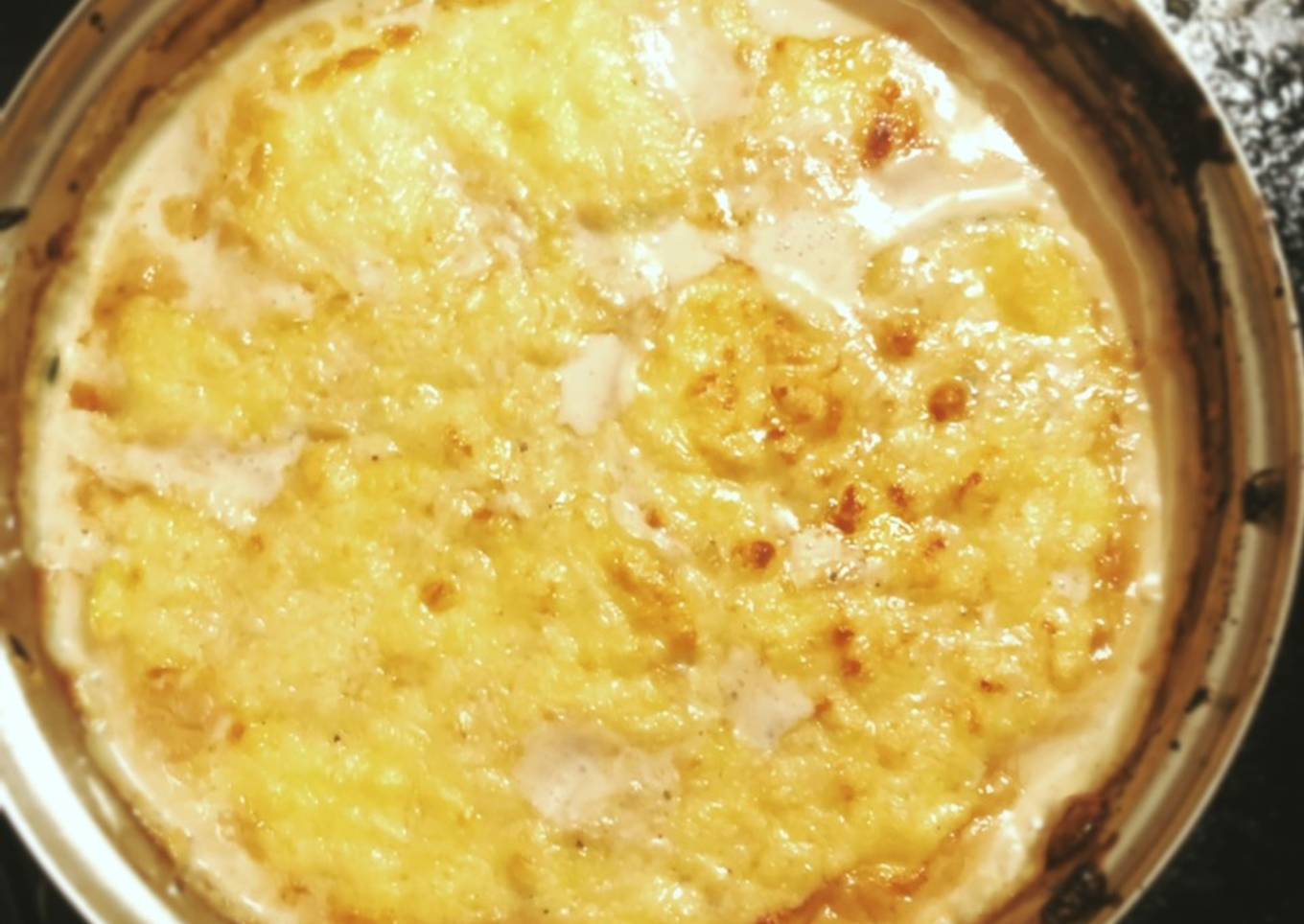 - Add heavy cream and simmer until bubbly and starts to thicken