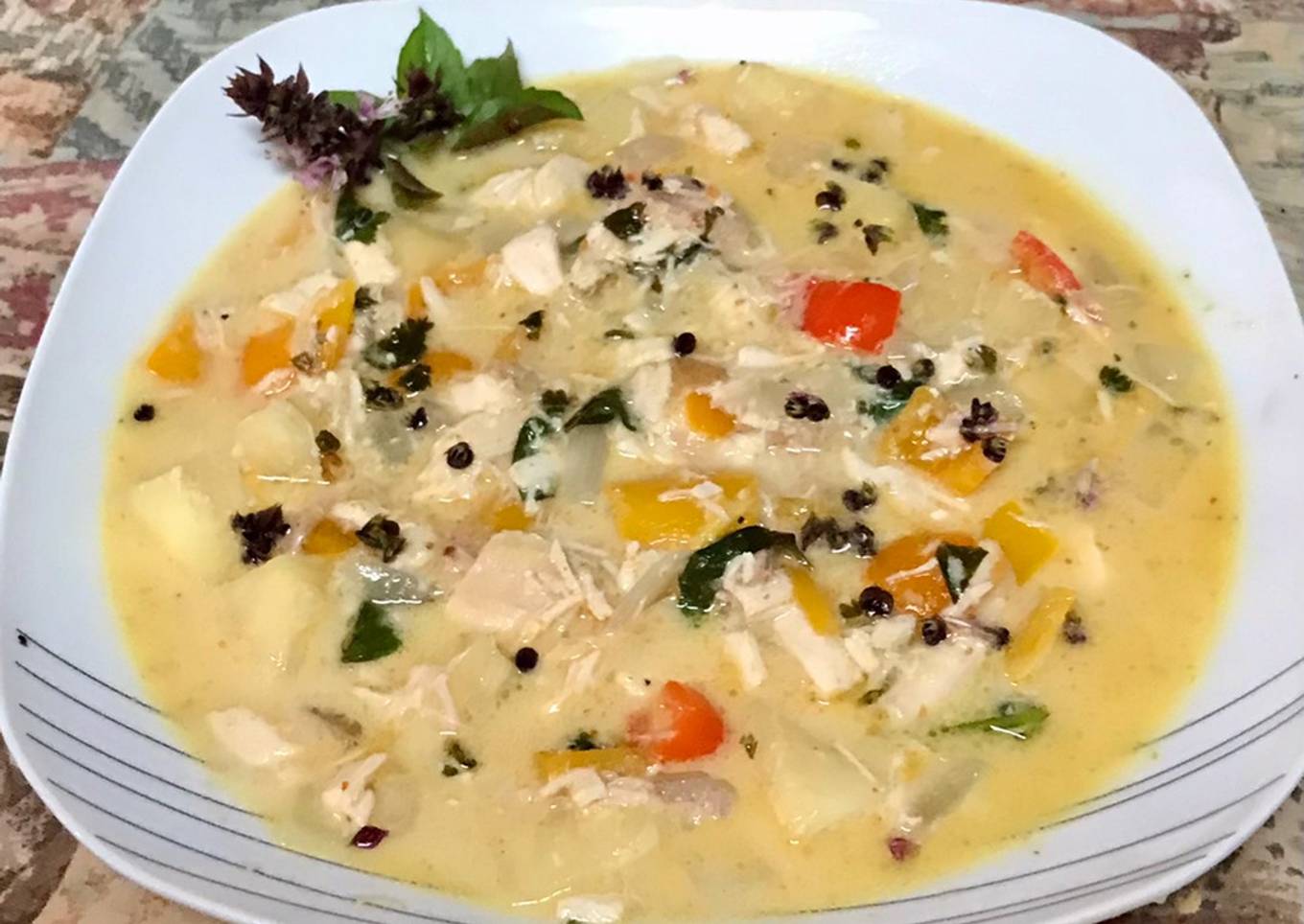 - Sauté ginger and garlic in pot or pan Using coconut oil, then sauté sweet peppers, sauté Sauté onions And put together into pot then add liquid formula and pineapple bring to a boil and simmer then add cilantro and basil