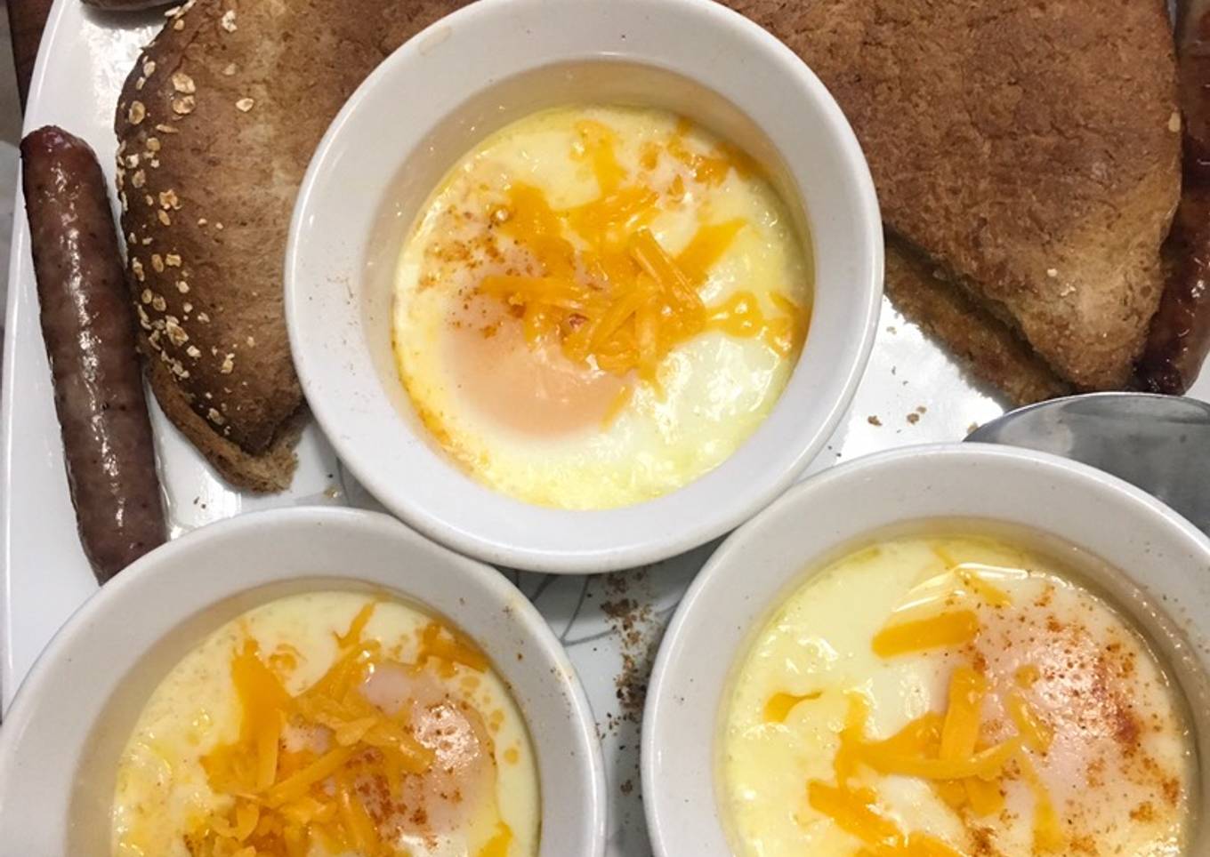 - Break eggs into individual buttered ramekins cover eggs with tablespoon cream
