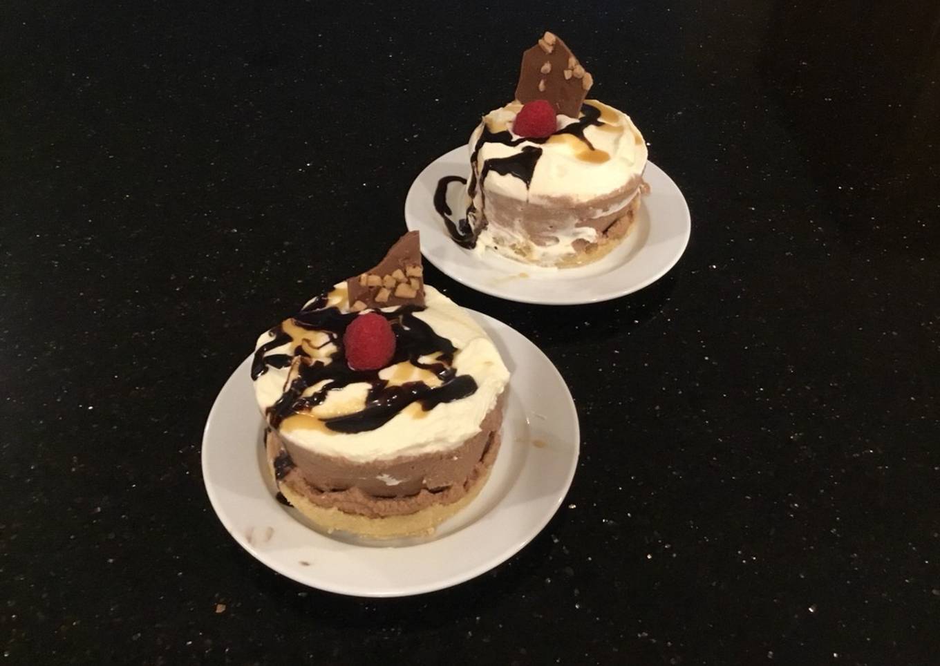 - Top with whipped cream, drizzle with chocolate and caramel and add a piece of caramel bark and a raspberry.