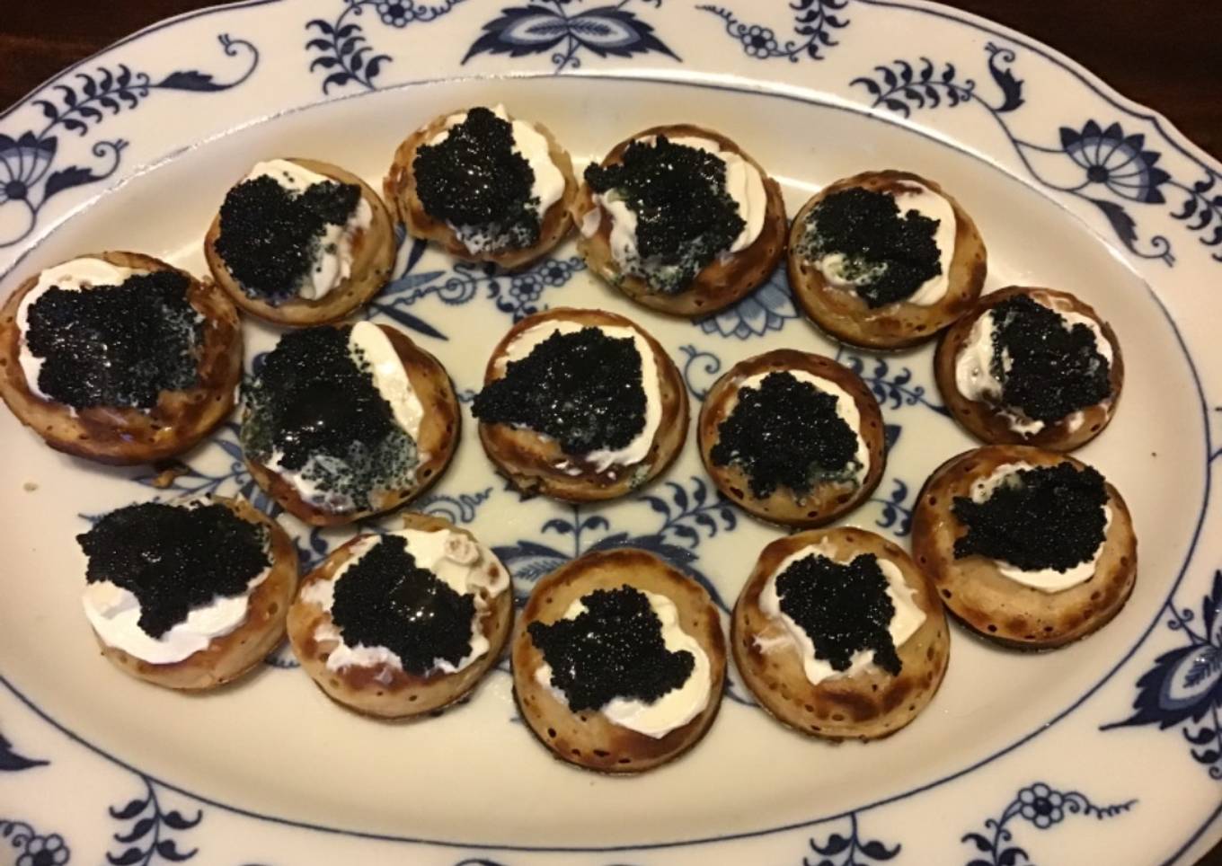 Now that we can find Romanoff caviar or Icelandic caviar on the internet for $12 a jar, we can treat ourselves to Blini appetizers, and so can you! Blinis are silver dollar sized pancake appetizers topped with caviar, chopped shallots and sour cream, served warm.