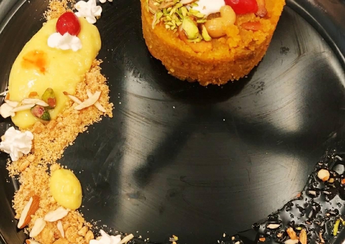 - Garnish moong halwa with dry fruits, whipping cream,cookie crumble and custard mousse