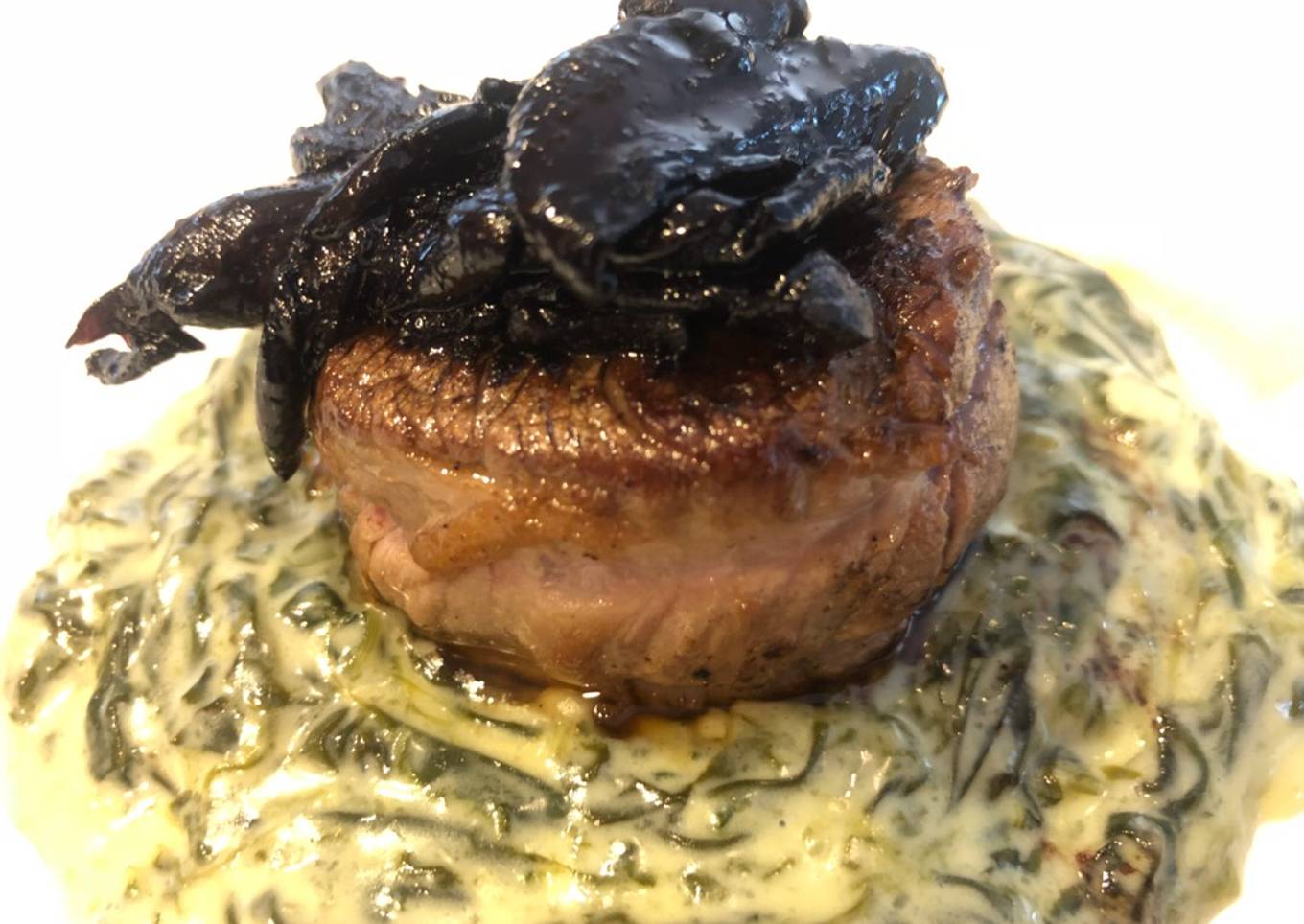 Beef filet on creamed spinach, topped with oyster mushrooms