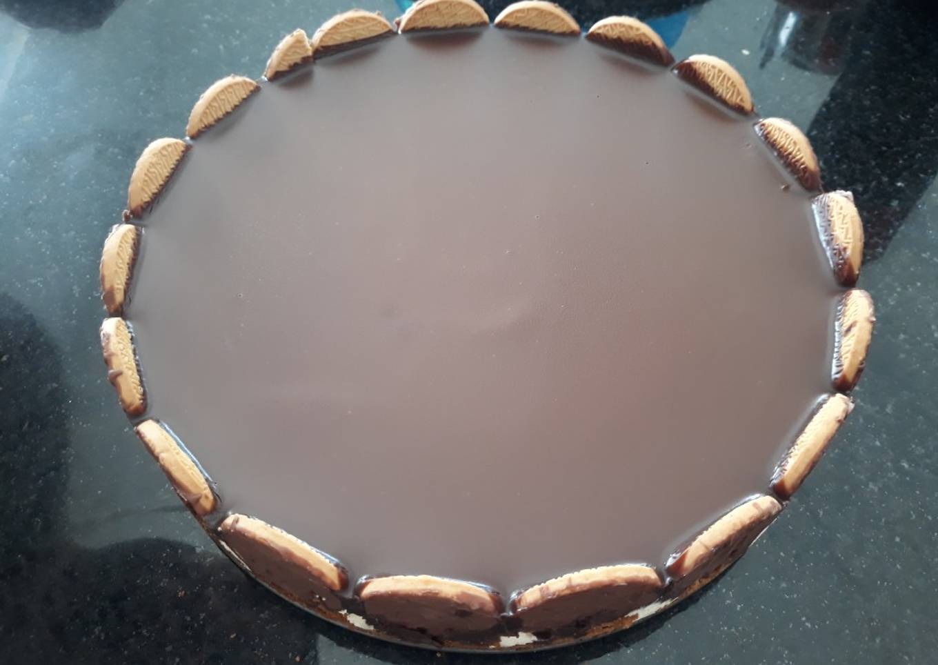 - Process the vanilla cookies and mix in with butter. Put at the bottom of a pan with removable bottom (no need to cover the sides). Take it to the oven (200°C pre heated) for 5-10 min. Let it cool. Now, put the chocolate covered cookies on de the sides, with the chocolate side to the pan (just like in the pictures!)