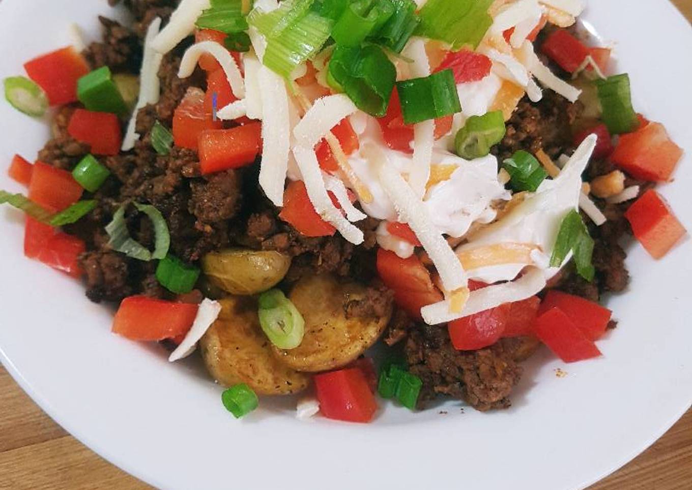 - Top your potatoes with the taco meat, the top with sour cream, red peppers,jalepeno,green onions, shredded cheese etc