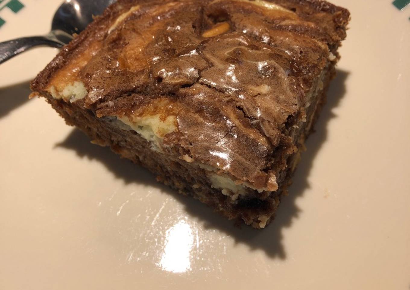- Using a dull butter knife gently swirl cream cheese mixture into brownie mixture......you want it to have a marbled look....