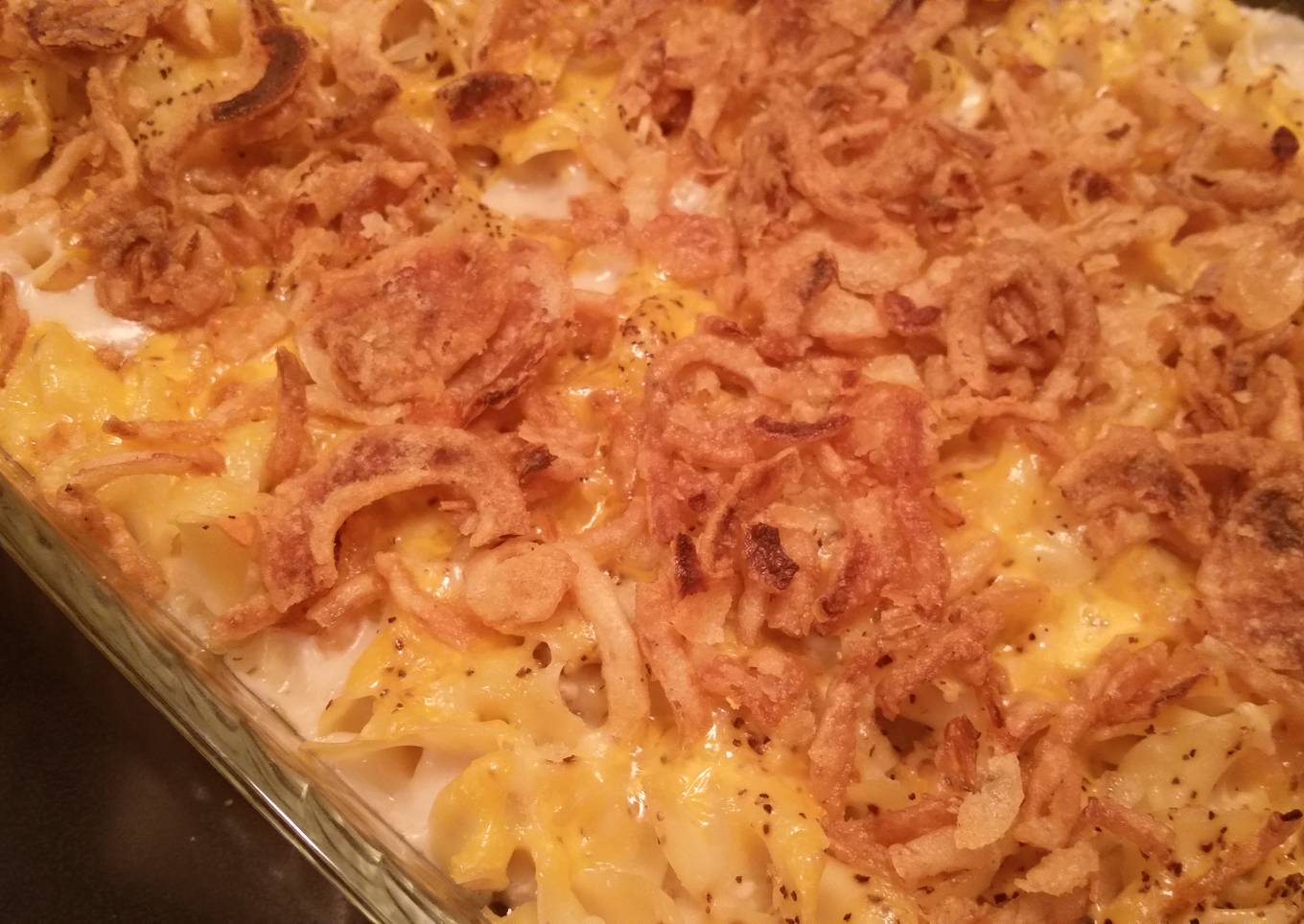 - Pour tuna and noodle mixture into 9"×13" baking pan. Sprinkle with pepper, garlic powder and spread both cheeses. Add french fried onions evenly over the top of noodle mixture.