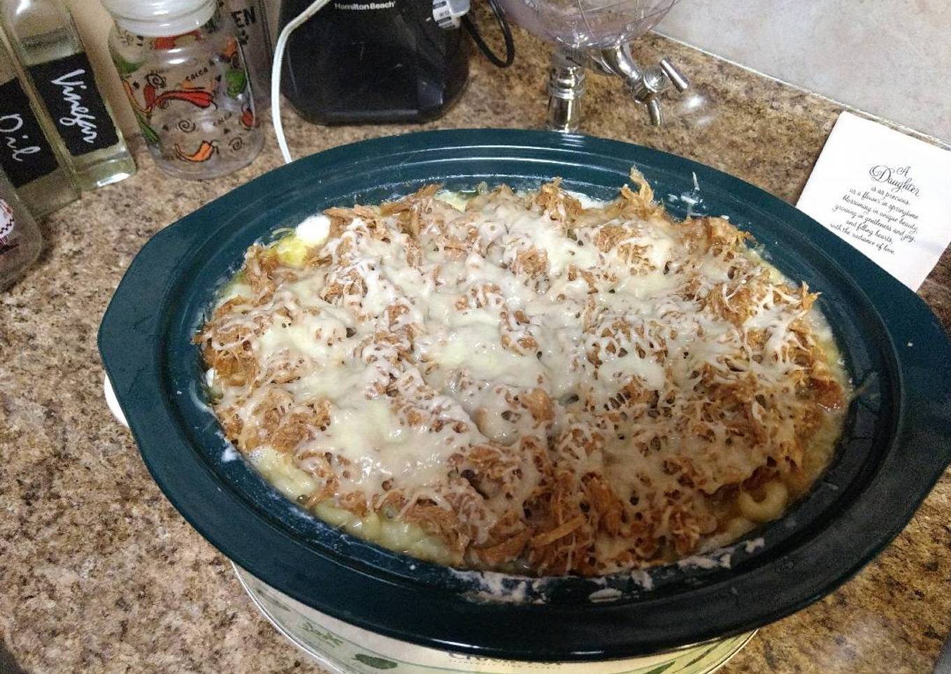- In a casserole dish mix macaroni and cheese sauce together. Then layer BBQ pork on to the macaroni. Top with a hand full of mozzarella.