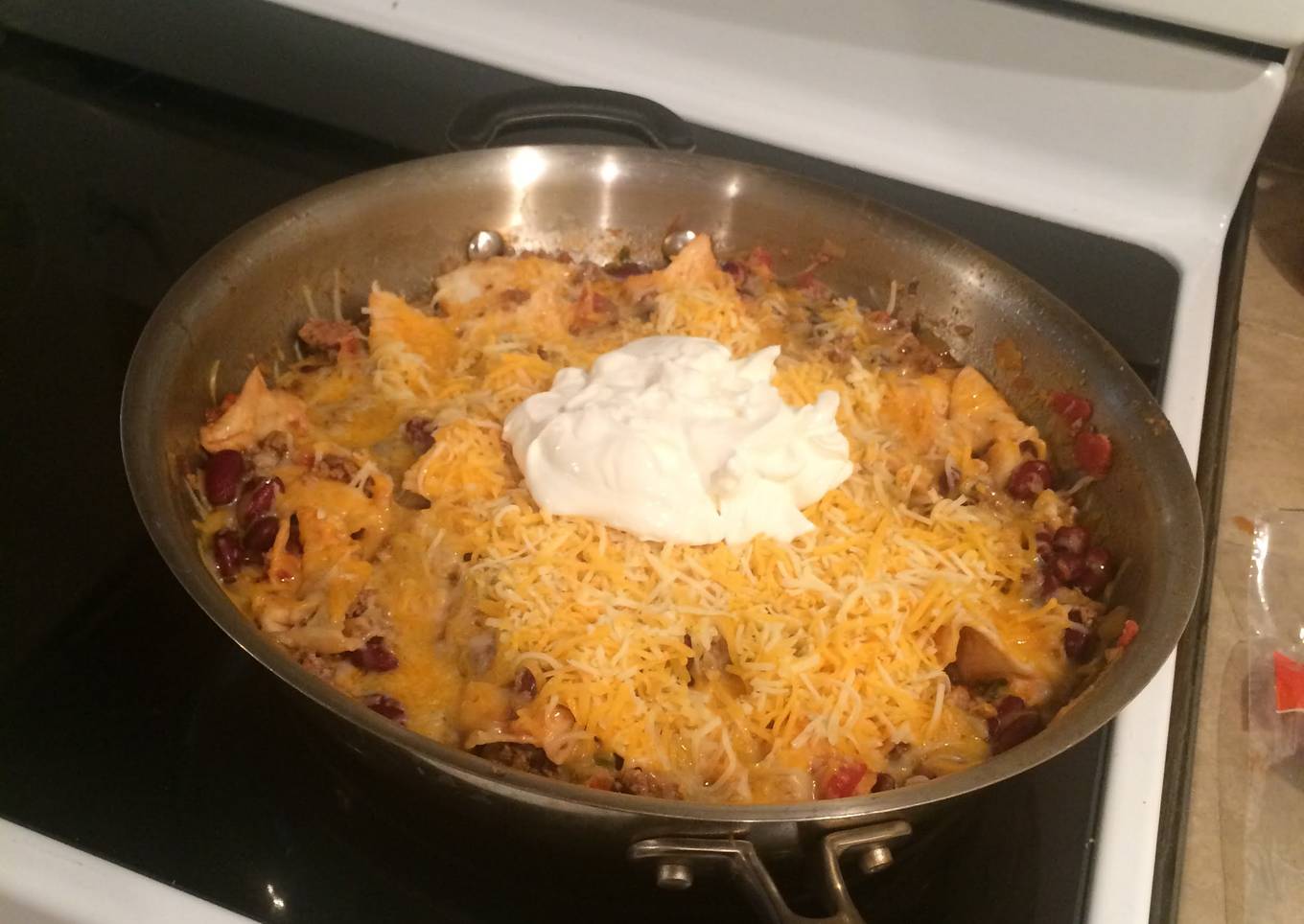 - Stir in tortillas and top with cheese. Cover and let sit for 5 minutes or until cheese is melted. Top with sour cream and onions.