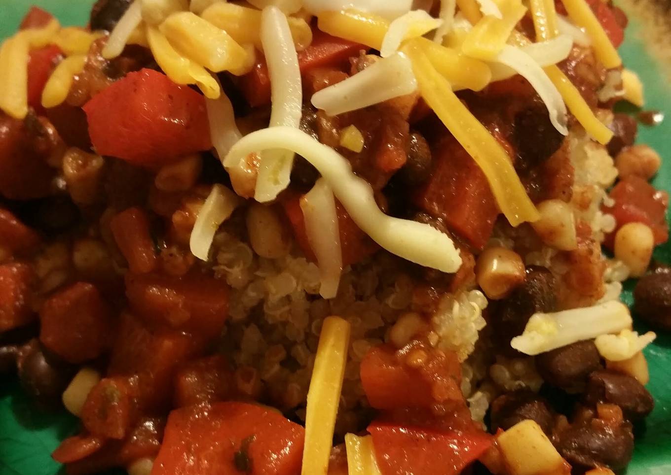 - When quinoa is done, fluff with fork, place a serving size on plate and smother with vegetables. Top with grated cheese and sour cream, enjoy alone or with tortilla chips!