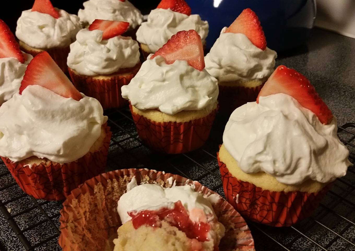 - Using a knife, frost the cupcakes with whipped cream, and garnish with a slice of fresh strawberry.