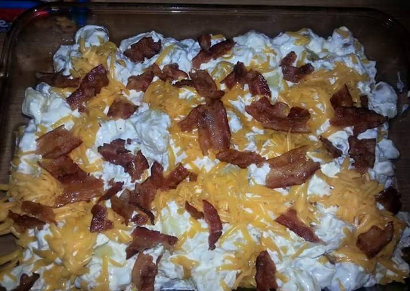 - Make layers beginning with potatoes then cheese. I made 2 layers. Top with cheese and bacon.