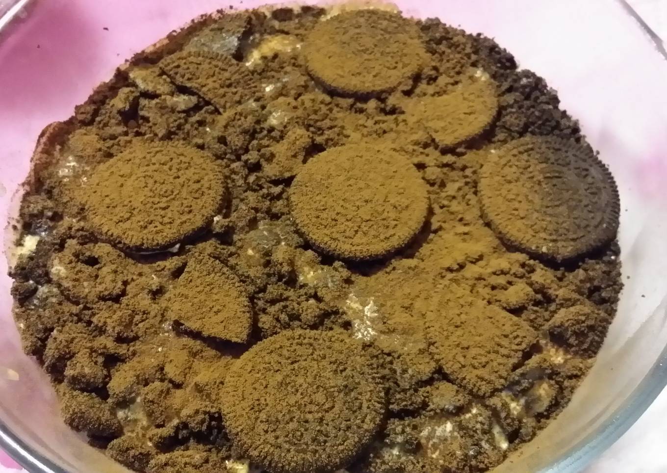- Crush Oreo cookies,set 1/4 cup aside for topping.
