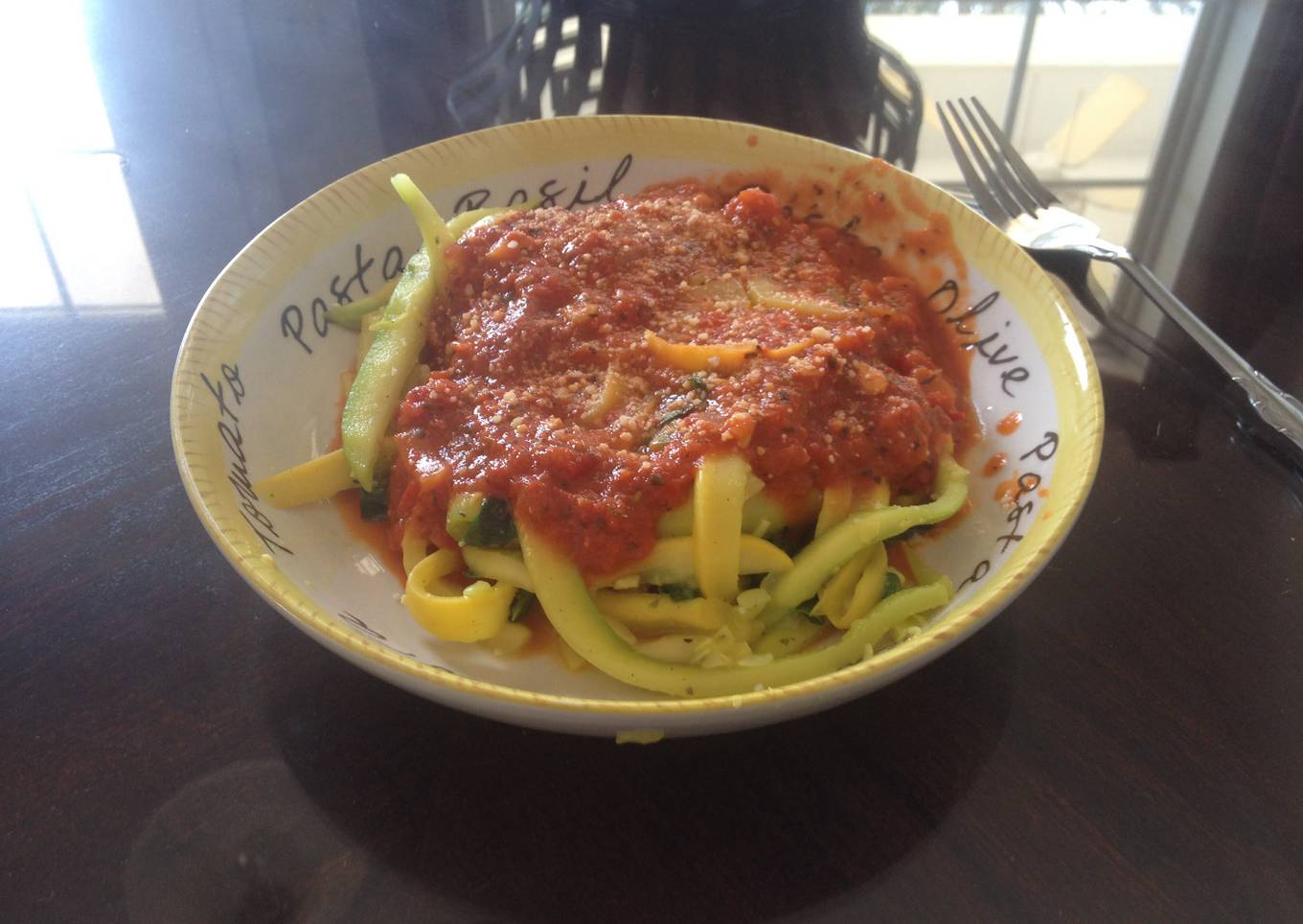 - Top "noodles" with pasta sauce, and sprinkle Parmesan on top.