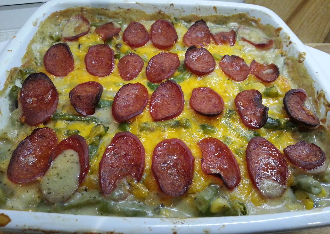 Green bean and potato casserole with pepperoni and cheese