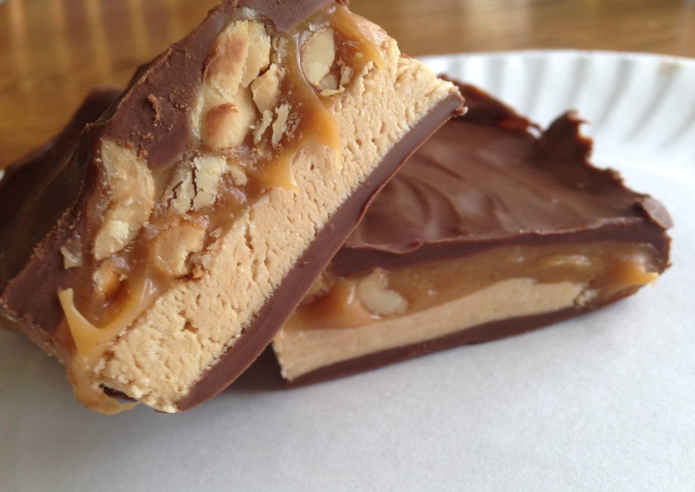- Layer 1- melt together 1 cup chocolate chips and 3 tablespoons peanut butter and spread evenly into a brownie pan lined with parchment paper. Put in freezer until hard.