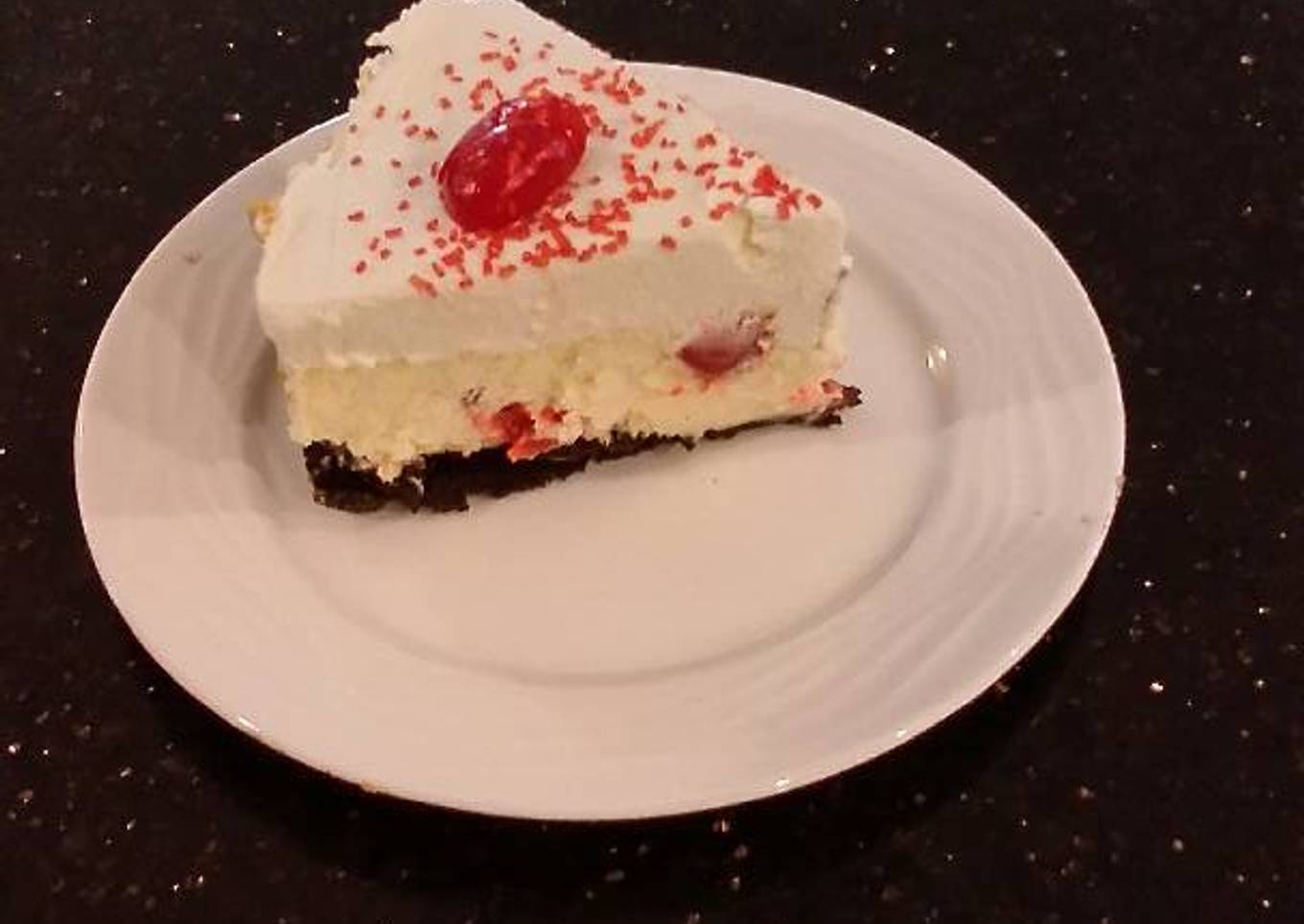 Here is Wha rich, creamy white chocolate cheesecake with chips of marachino cherries throughout the cheesecake and cherry flavor in the cheescake. It's topped with a light and fluffy white chocolate truffle mousse topping